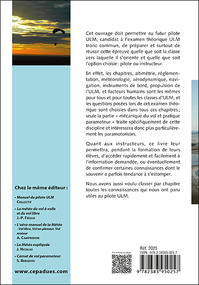 Cet ouvrage doit permettre au futur pilote ULM, candidat à l’examen théorique ULM tronc commun, de préparer et surtout de réussir cette épreuve quelle que soit la classe vers laquelle il s’oriente et quelle que soit l’option choisie : pilote ou instructeur.