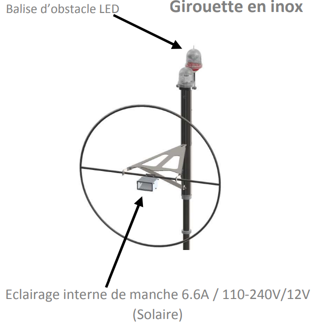 Plusieurs accessoires sont disponibles pour l’éclairage de manche ou le balisage haut de mât (Alimentation solaire également disponible) :