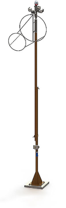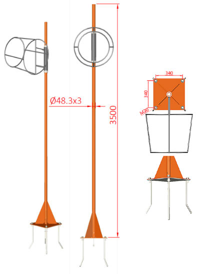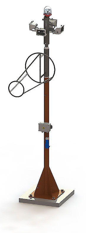 Notre Mât est conforme à la réglementation FAA. Il est fabriqué en standard en acier galvanisé avec une peinture orange et il est disponible en 3 ou 6 mètres. La version 3 mètres est basculante en partie basse du mât alors que la version 6 mètres est basculante en milieu de mât. Trois diamètres de girouette préformée sont proposés en standard, avec les manches à vent correspondantes. De nombreuses options sont disponibles, tels que l’éclairage de manche, externe (disponible en standard) ou interne, le balisage haut de mât, etc. De même ces options sont proposées sous différentes tensions d’alimentation (24-48V, 230V ou solaire) mais aussi directement sur une boucle de courant 6,6 A.