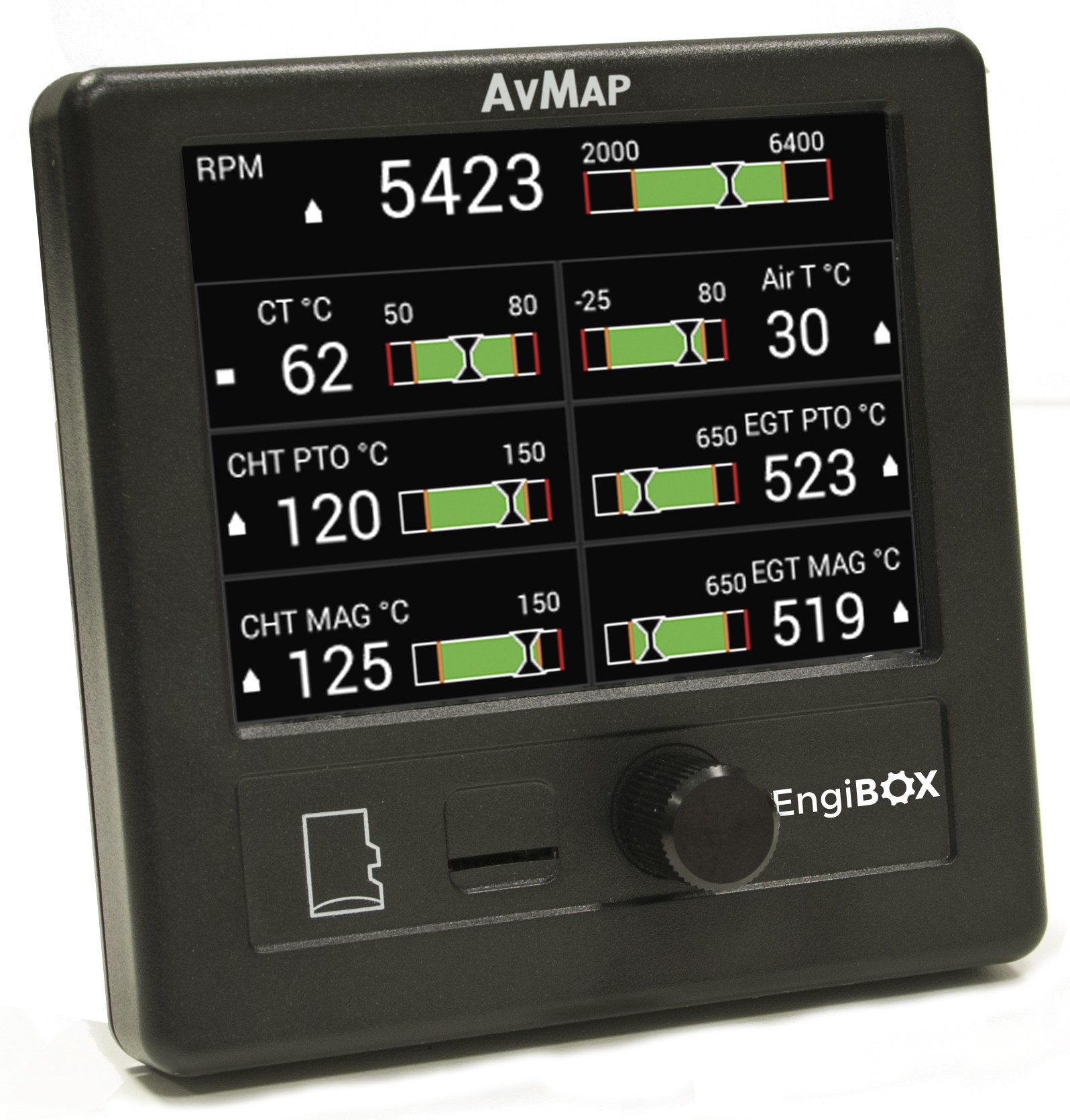 AvMap vous présente l'EngiBox, un EMS (Système de contrôle de moteur - Engine Monitoring System) de faible dimension (diamètre standard de 80 mm avec un boitier 95 x 95 mm sur le tableau de bord) et très léger (250 g), pour la gamme ROTAX