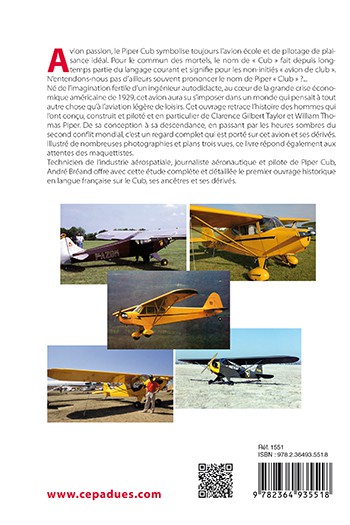 Né de l’imagination fertile d’un ingénieur autodidacte, au cœur de la grande crise économique américaine de 1929, cet avion aura su s’imposer dans un monde qui pensait à tout autre chose qu’à l’aviation légère de loisirs. Cet ouvrage retrace l’histoire des hommes qui l’ont conçu, construit et piloté et en particulier de Clarence Gilbert Taylor et William Thomas Piper. De sa conception à sa descendance, en passant par les heures sombres du second conflit mondial, c’est un regard complet qui est porté sur cet avion et ses dérivés. Illustré de nombreuses photographies et plans trois vues, ce livre répond également aux attentes des maquettistes.