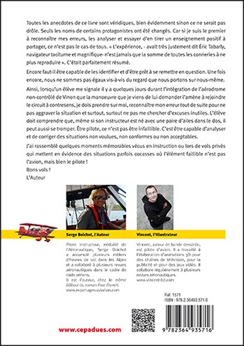 Toutes les anecdotes de ce livre sont véridiques, bien évidemment sinon ce ne serait pas drôle. Seuls les noms de certains protagonistes ont été changés, afin d’épargner leur descendance de la honte et de l’infamie. Car si je suis le premier à reconnaître mes erreurs, les analyser et essayer d’en tirer un enseignement positif à partager, ce n’est pas le cas de tous. L’expérience, avait très justement dit Éric Tabarly, navigateur taciturne et magnifique, n’est jamais que la somme de toutes les conneries à ne plus reproduire. C’était parfaitement résumé. Encore faut-il être capable de les identifier et d’être prêt à se remettre en question. Une fois encore, nous ne sommes pas égaux vis-à-vis du regard que nous portons sur nous-même. Ainsi, lorsqu’un élève me signale il y a quelques jours durant l’intégration de l’aérodrome non contrôlé de Vinon que la manœuvre que je viens de lui demander l’amène à rejoindre le circuit à contresens, je dois prendre sur moi, reconnaître mon erreur tout de suite pour ne pas aggraver la situation et surtout, surtout ne pas me chercher d’excuses inutiles. L’élève doit comprendre que, même si son instructeur est né avec une paire d’ailes dans le dos, il peut aussi se tromper. Être pilote, ce n’est pas être infaillible. C’est être capable d’analyser et de corriger des situations non voulues, non conformes ou non acceptables.