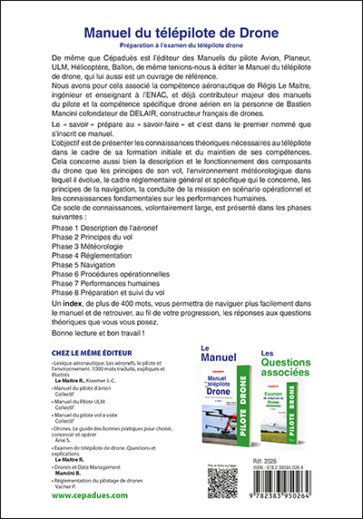 Plus qu’un simple bachotage, l’objet de ce livre est de vous permettre d’aborder en profondeur les thèmes techniques et réglementaires liés à l’exploitation d’un drone et de vous accompagner encore longtemps après l’obtention du diplôme.